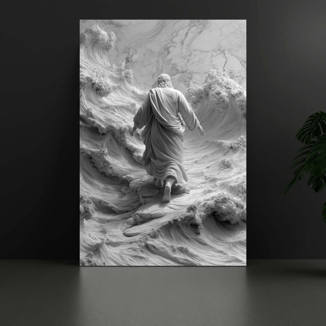 Nesta obra, Jesus é visto de costas, caminhando serenamente sobre as águas revoltas. A imagem simboliza a fé que conduz mesmo em meio às tempestades, representando a confiança absoluta no poder divino. A composição em tons de mármore e luz suave cria uma atmosfera de força e paz, onde o movimento das ondas expressa a superação e o propósito.