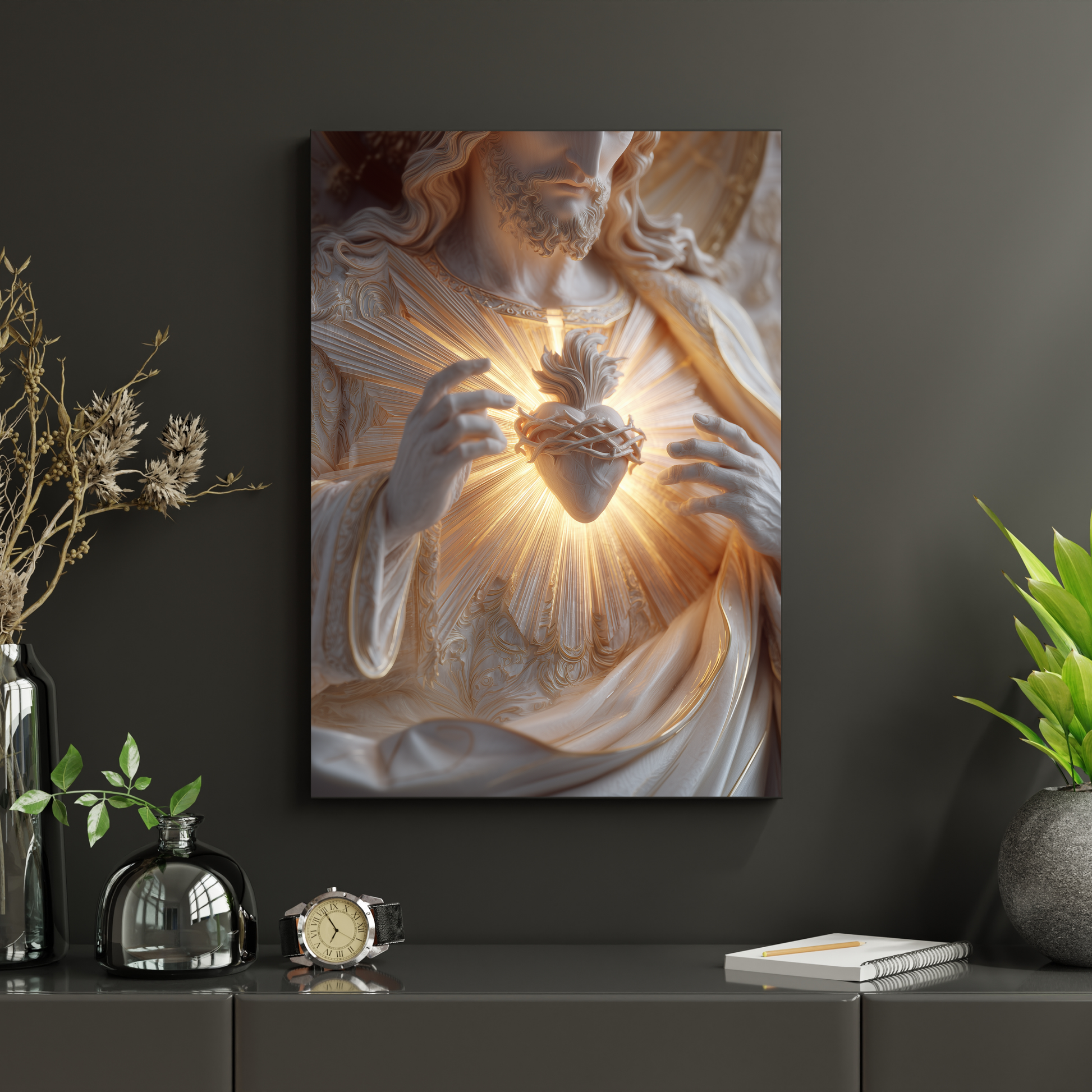 “O Resplendor do Sagrado Coração” é uma obra desenvolvida para transmitir a força silenciosa, a pureza e a profundidade espiritual da devoção ao Sagrado Coração de Jesus. Nessa composição, a luz que irradia do Coração simboliza proteção, verdade e renovação interior — um convite permanente à fé e à esperança.