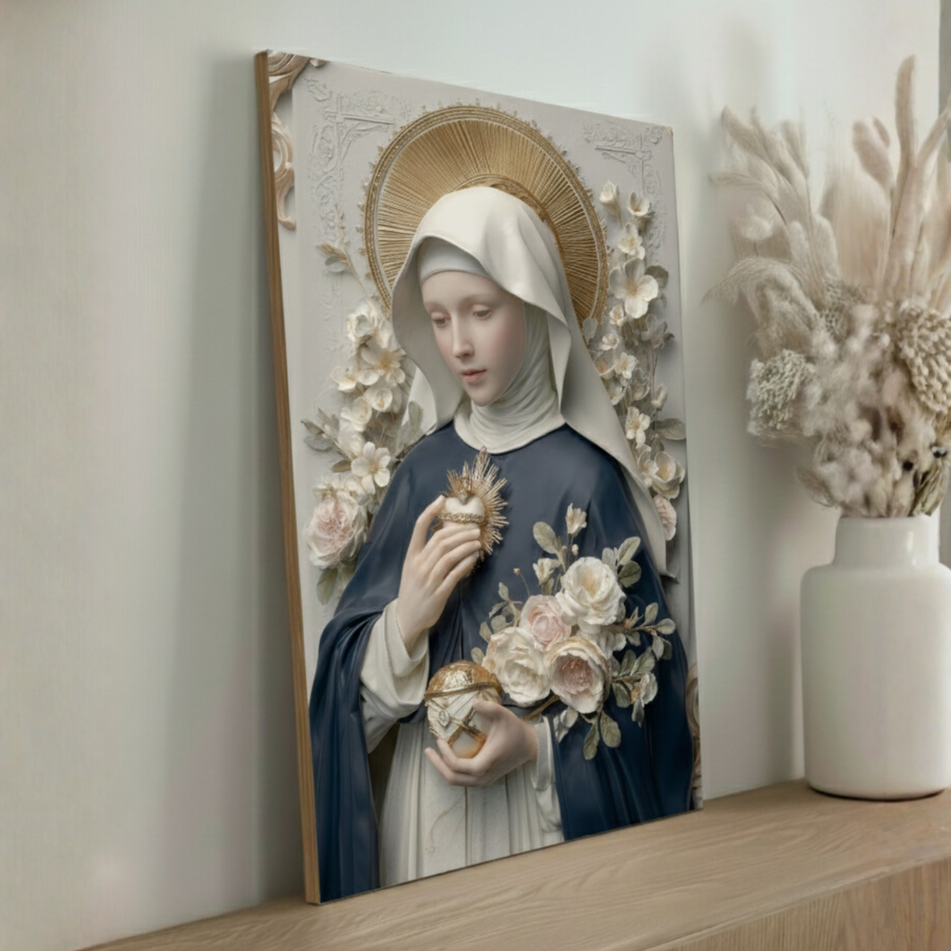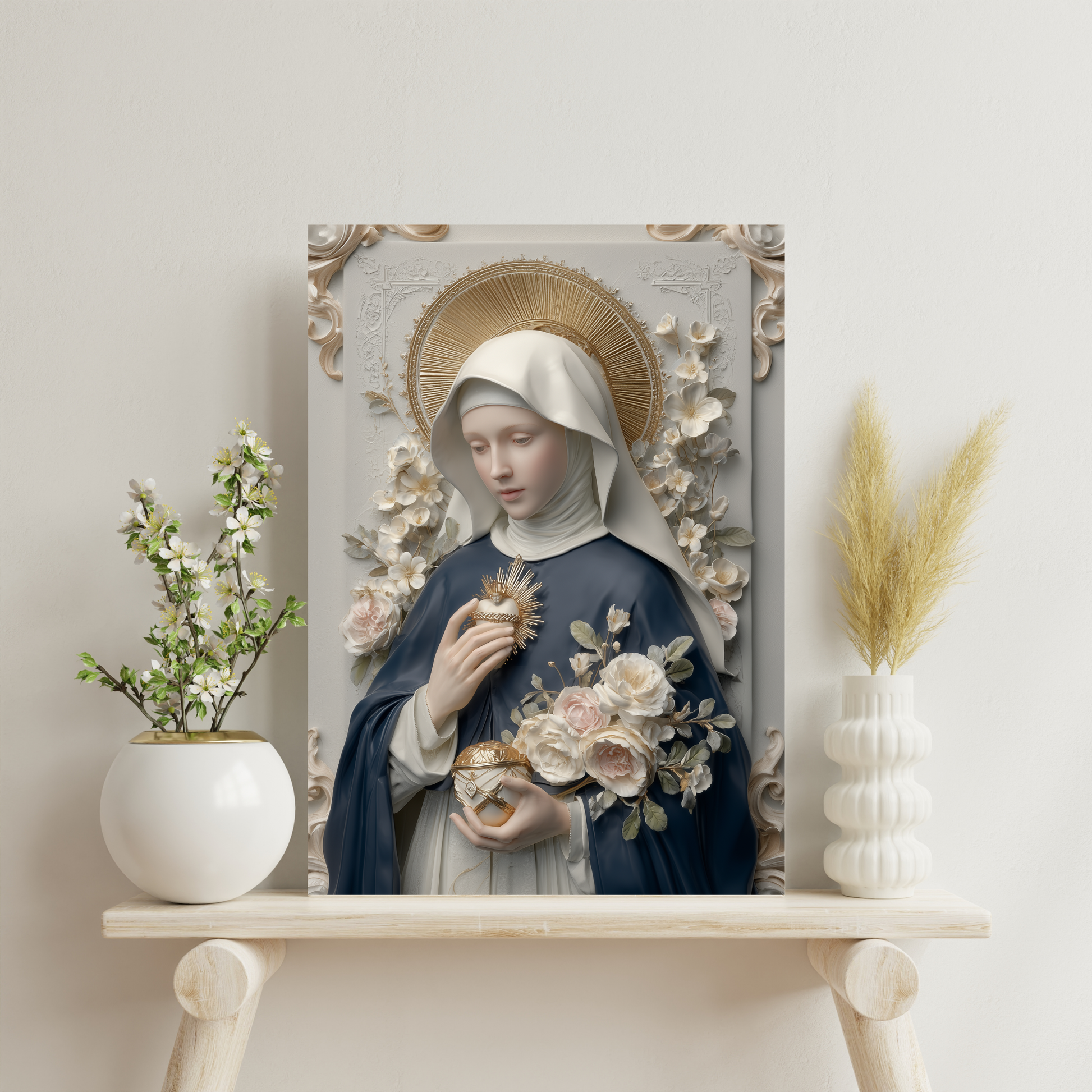Nesta obra, a santa aparece em atitude de recolhimento e ternura, segurando os símbolos das graças celestes, cercada por flores que representam pureza, entrega e amor divino. O halo dourado expressa a luz da missão que lhe foi confiada, enquanto suas feições serenas lembram que a verdadeira santidade nasce da simplicidade e da obediência.